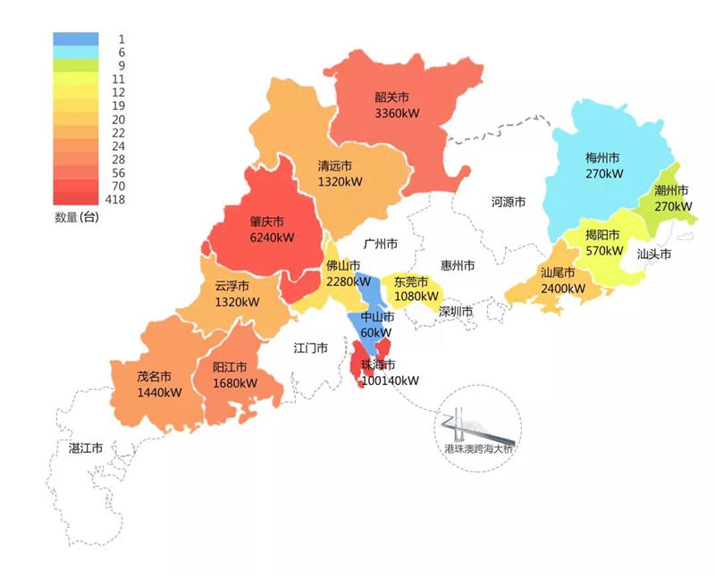 2018年,在港珠澳大桥充电桩项目中,勤汀(上海)科技有限公司在港珠澳大桥珠海端口岸人工岛搭建的充电管理平台及电能量采集终端,为大桥的绿色运营和电力保障提供技术支持。除此之外,仅广东省内,勤汀(上海)科技有限公司充电桩涵盖肇庆、珠海等14个城市,具体分布情况如下图所示。